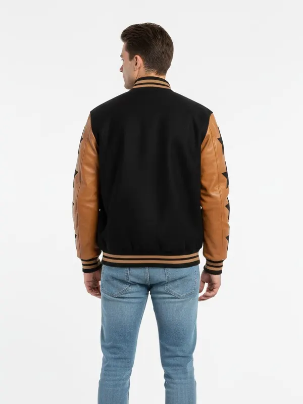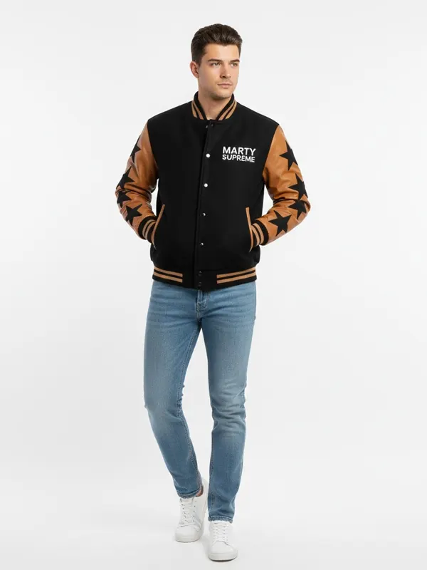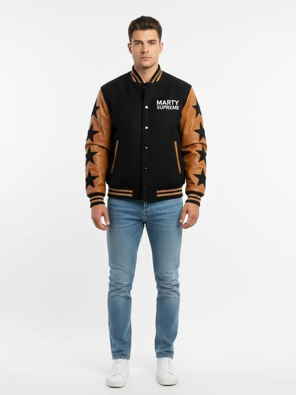 Straight from the Marty Supreme line, this black and brown stars varsity jacket is made for bold looks and confident street style, it mixes dark tones with eye catching details, soft fabric feels comfortable, star pattern adds character, secure closure keeps fit neat, ribbed edges support shape, practical pockets help daily use, this jacket stands out without effort.