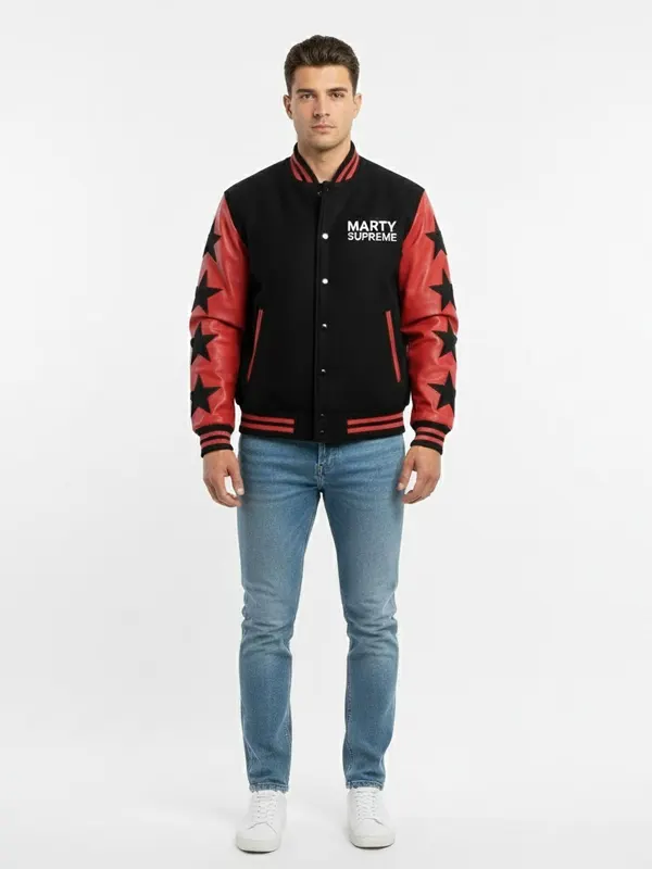 Coming from the Marty Supreme movie this black and red stars varsity jacket is ideal for standout looks and everyday wear, it mixes bold design with reliable comfort, smooth outer finish feels pleasant, star details bring strong visual impact, easy closure supports quick styling, ribbed trims keep structure, useful pockets add function, this jacket works well for casual plans and social outings.