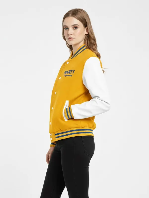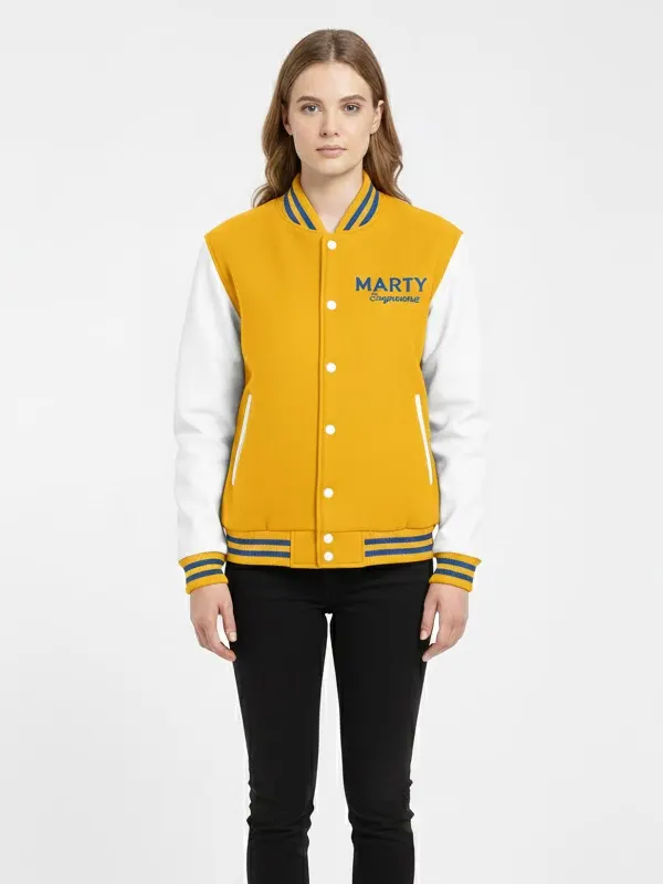 Coming from the Marty Supreme line, this yellow and white varsity jacket is perfect for bright looks and daily comfort. It offers a fresh appearance with easy wear; the smooth fabric feels light, the clean color mix lifts outfits, the classic shape stays timeless, the ribbed trims improve fit, and the useful pockets add function. This jacket suits walks, weekends, and simple social outings.