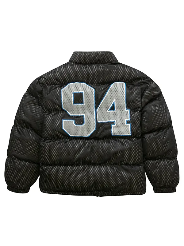 Stay warm and stylish with this Supreme Mesh Jersey Puffer Jacket. Designed with a unique mesh jersey outer layer, it features a bold Supreme logo across the chest and the number 94 on the back. This jacket combines athletic aesthetics with high-performance insulation, making it the perfect choice for cold weather without sacrificing your streetwear edge.